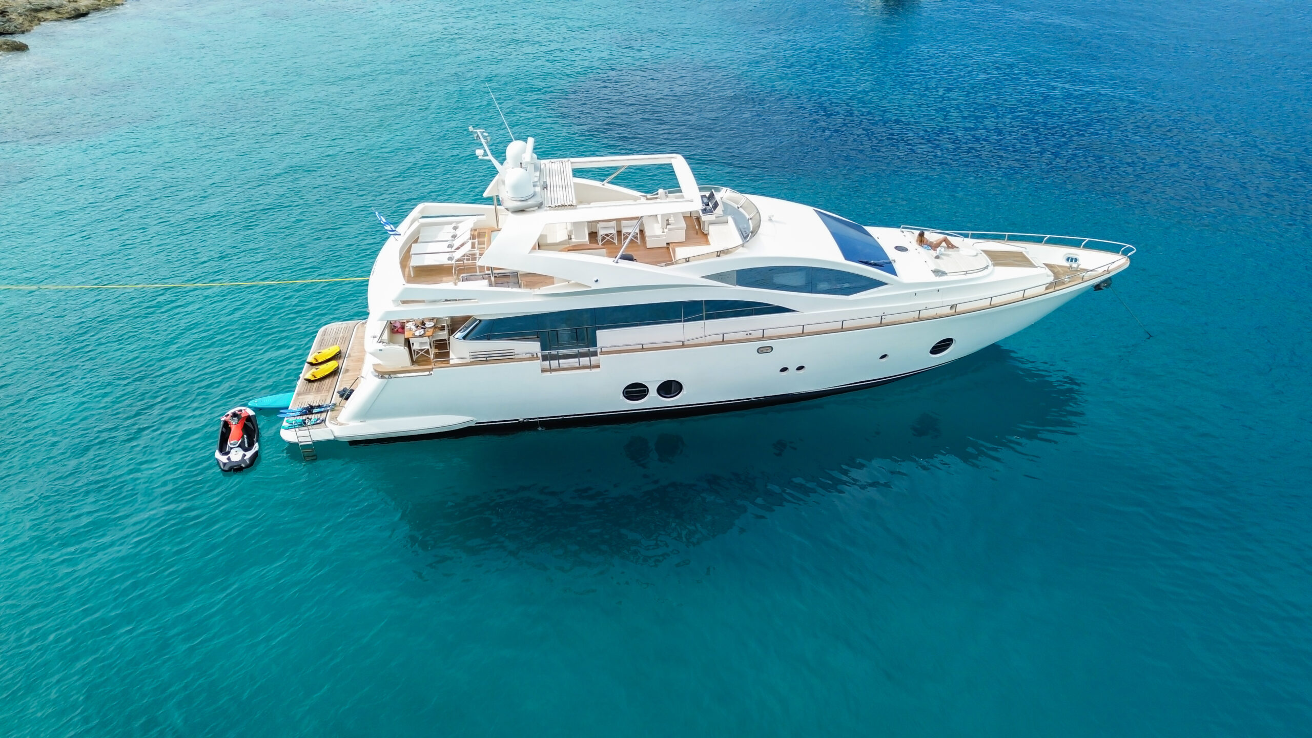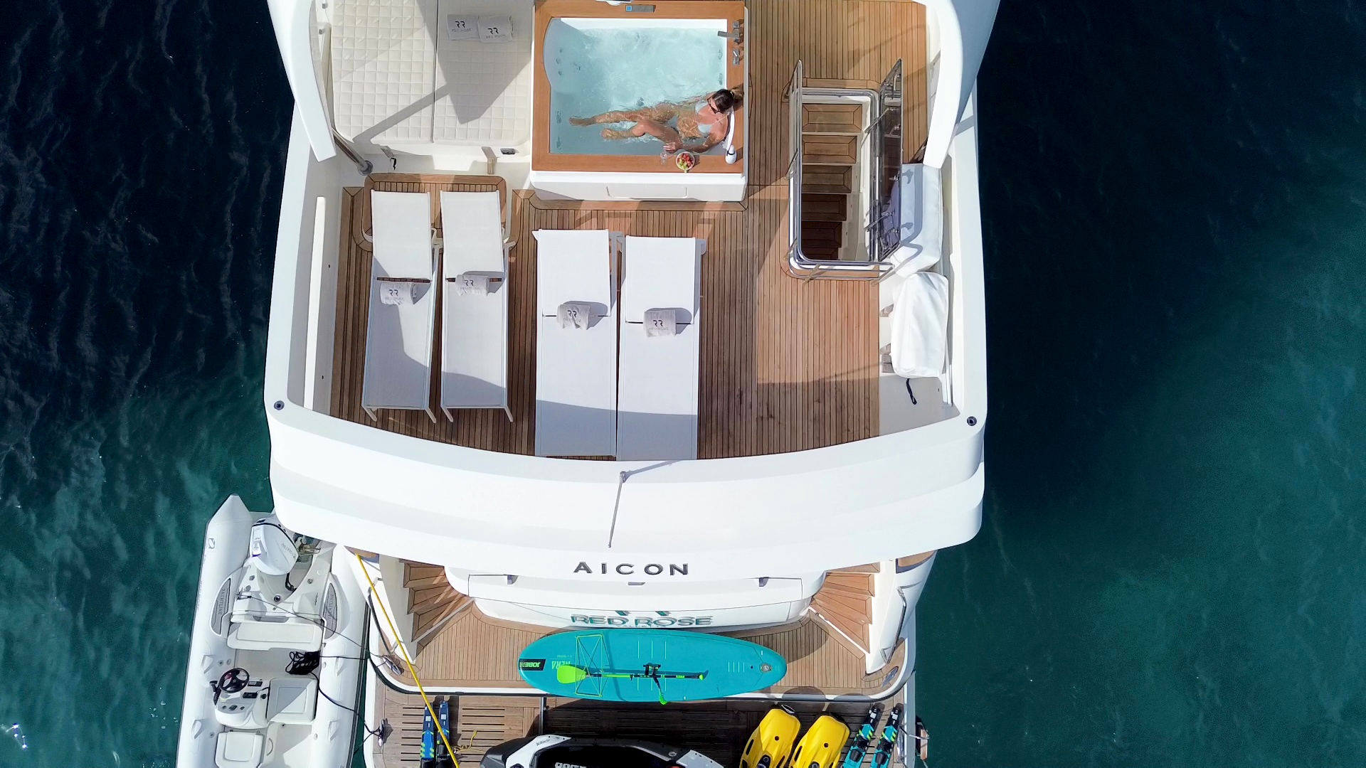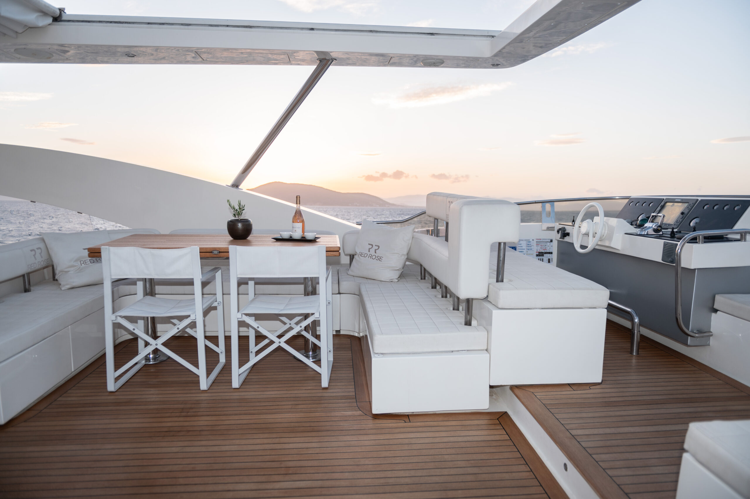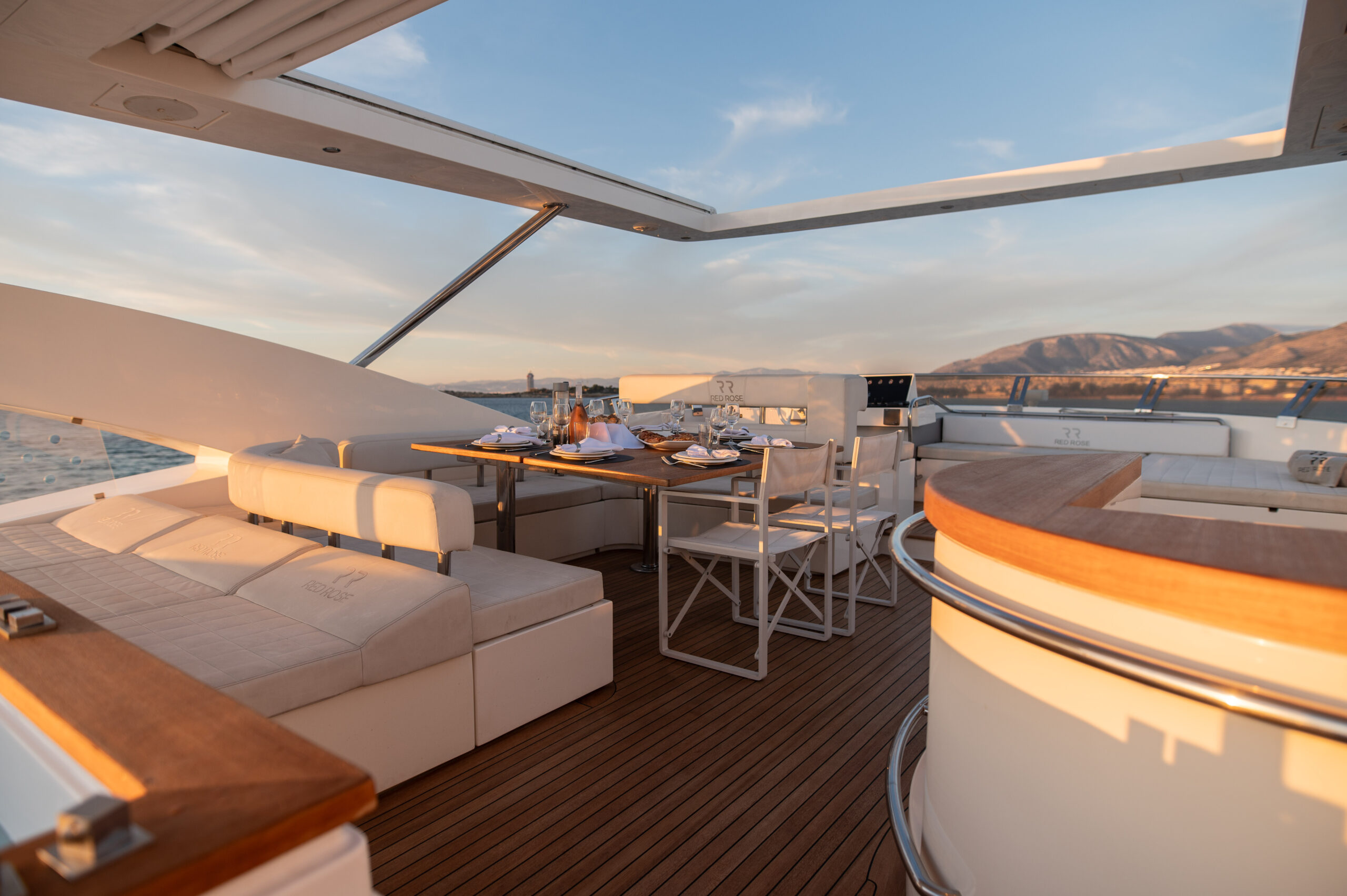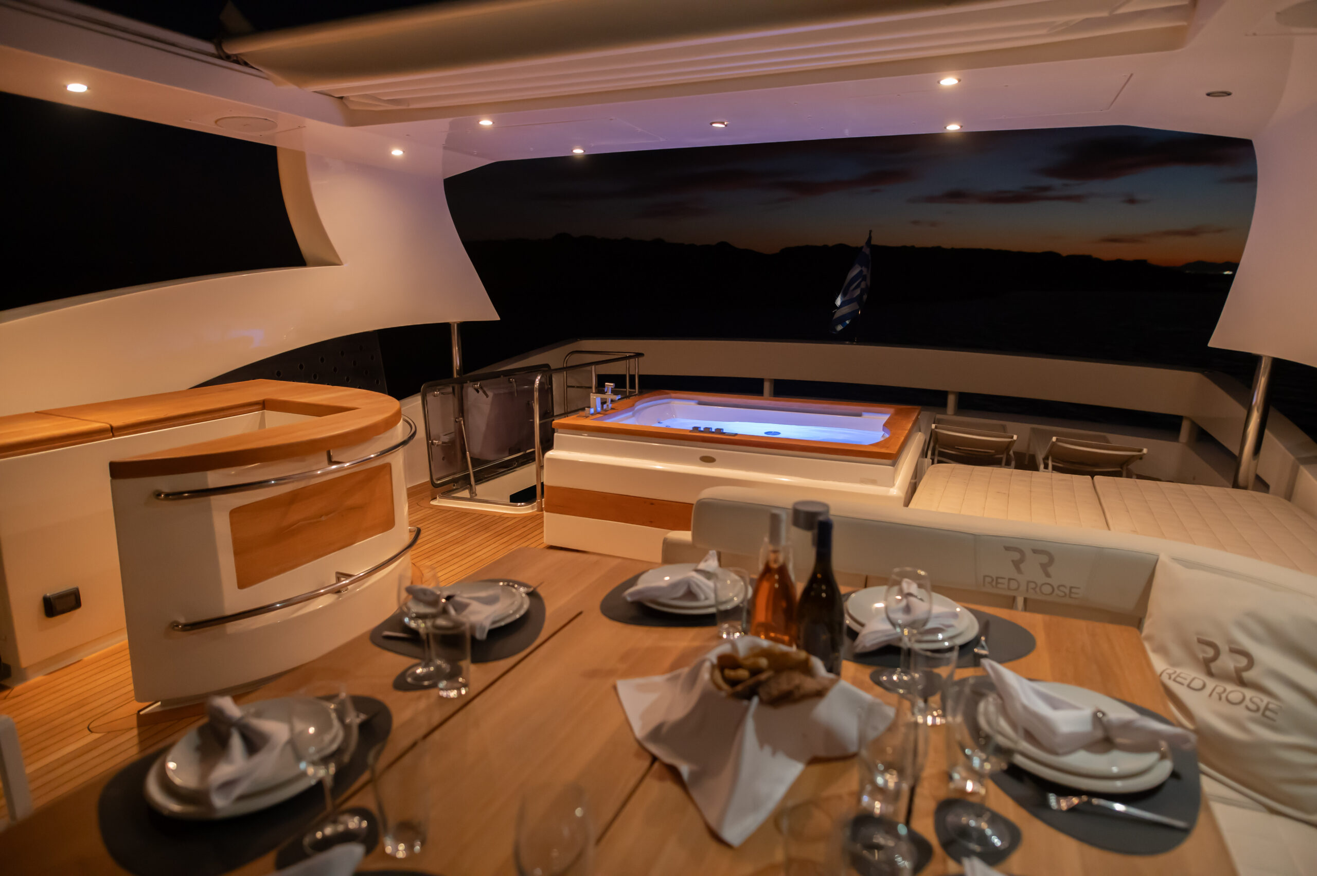 Designed for outdoor living, Red Rose boasts expansive deck areas perfect for long, sun-soaked days at sea. Guests can unwind in the spacious jacuzzi, relax beneath an oversized hardtop rarely found in yachts of her class, or gather in the generous seating areas for unforgettable alfresco dining — from relaxed breakfasts in the morning sun to elegant dinners under the stars.